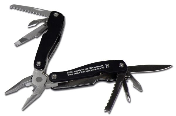 10teiliges Multifunktionswerkzeug (Zange, Säge, Kapselheber, Dosenöffner, Deckelöffner, Feile, Flachschlitz- und Kreuzschlitz-Schraubendreher, Messer) aus Metall mit schwarzem Softtouch-Griff.