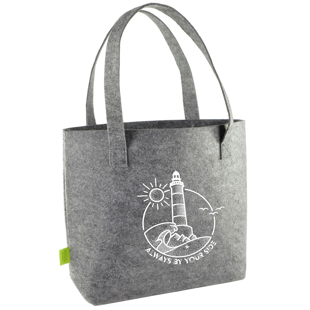 Großer Shopper aus recyceltem PET-Filz mit Bodenfalte und zwei langen Tragehenkeln. Das elegante Siebdruck-Motiv veredelt den robusten Einkaufsbegleiter.