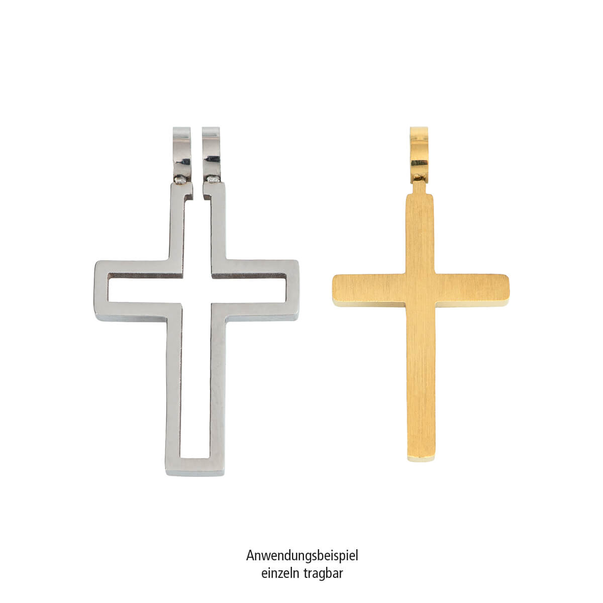 Das größere Kreuz ist glänzend poliert, das kleine matt in goldfarben. Jedes Teil kann für sich alleine getragen werden. Lieferung ohne Kette.