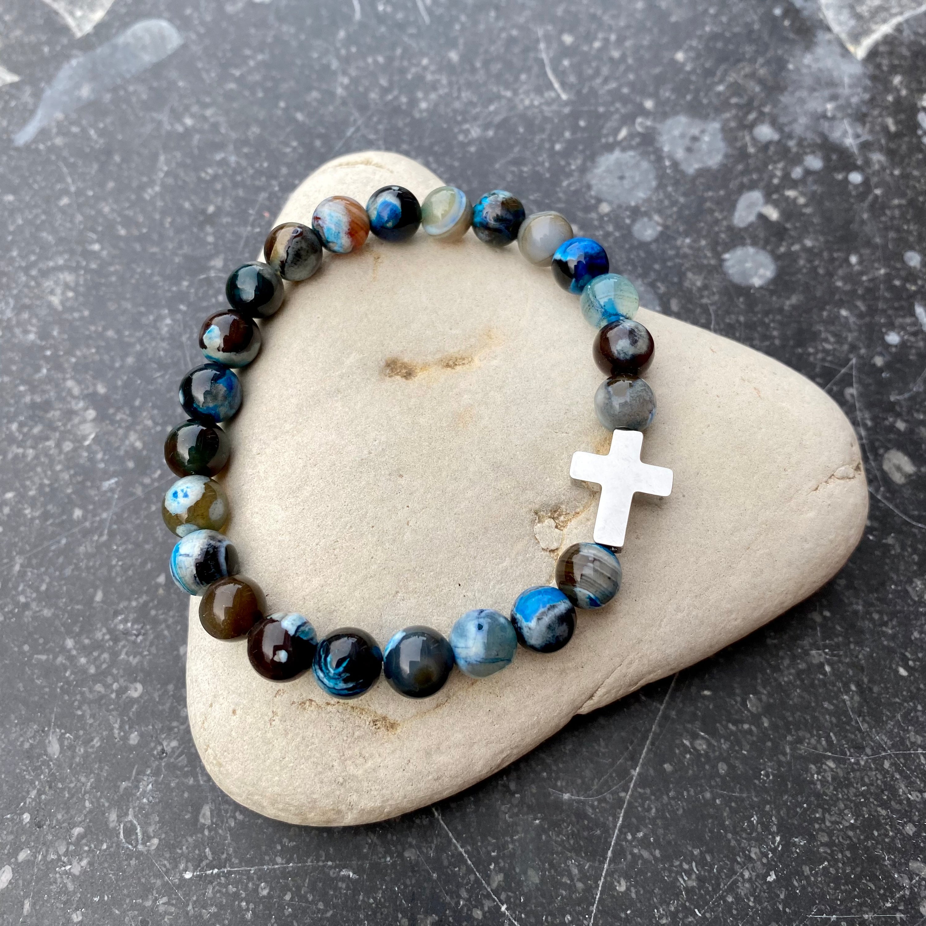 Das edle und schlichte Armband besteht aus feinen Halbedelsteinen (Achat) in Blau/Braun sowie einem silberfarbenen Edelstahl-Kreuz und ist auch für Männer geeignet.