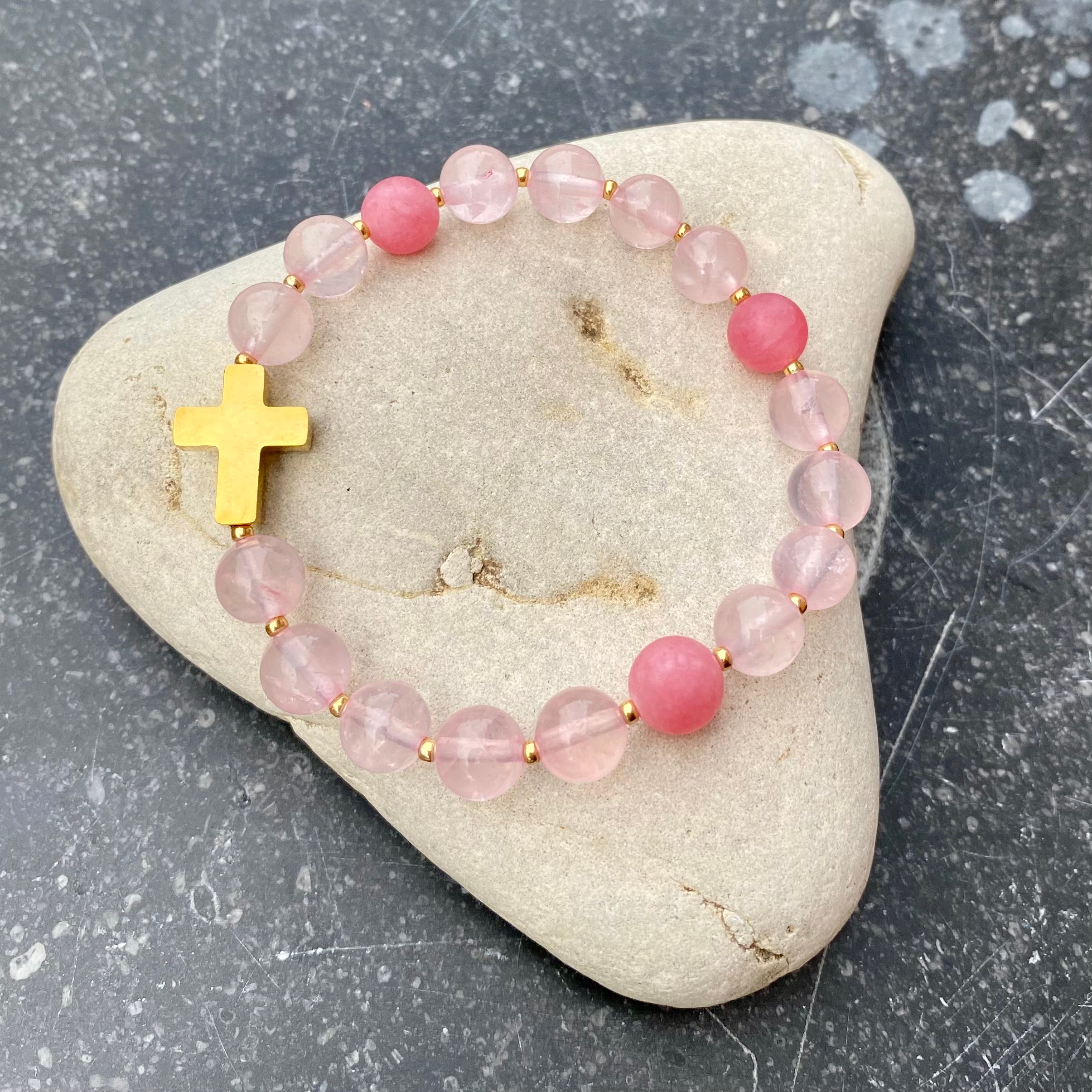 Armband Nina mit goldfarbenem Kreuz (Rosenquarz)
