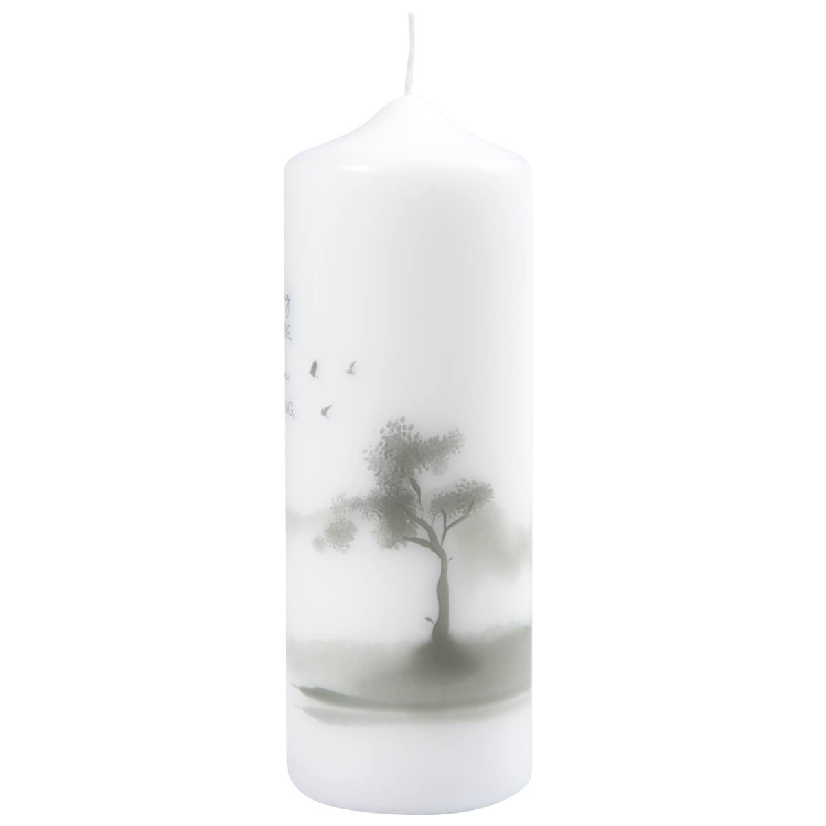 Modern gestaltete Gedenk-Trauerkerze mit Motiv Landschaft und Text:
