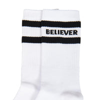 Stylisches und bequemes Paar Socken für Sport und Alltag! Hochwertig verarbeitet, mit schwarzen Ringeln und "BELIEVER" im weichen Bündchen eingestrickt.