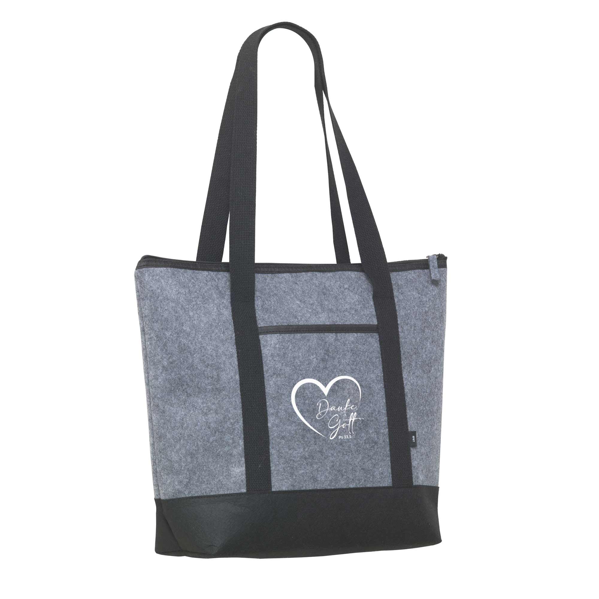 Die Innenseite ist aus isoliertem Aluminium. Ideal für den Transport z.B. von Tiefkühlkost, perfekt, um Speisen und Getränke unterwegs kühl zu halten. Versehen ist die Filz-Kühltasche mit der beliebten Aussage "Danke, Gott Ps 33,5".