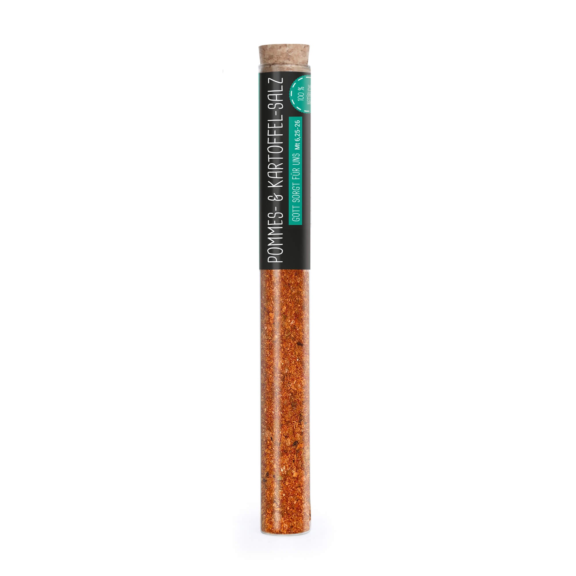 Inhalt: 40g Pommes- und Kartoffelsalz im Glaszylinder aus recyceltem Glas mit Korkstopfen