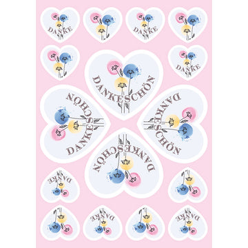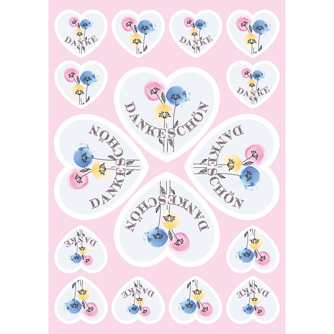 Auf jeder Aufkleber-Grußkarte befinden sich 16 Aufkleber in Herzform (4 größere und 12 kleine). Die Motive sind auf besonders stabilem glänzenden Aufkleberkarton gedruckt.