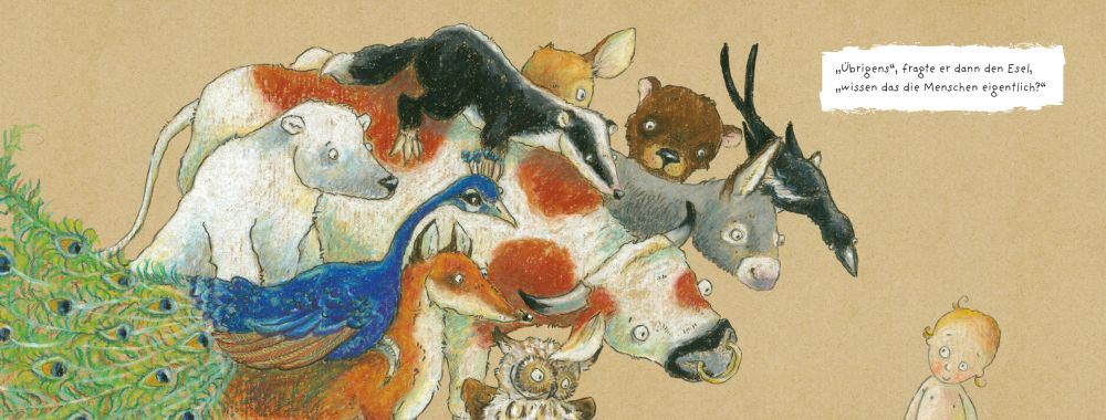 "Die Gans", sagt der Fuchs. "Der Baum", ist das Reh sicher. Und während der Eisbär von weißen Weihnachten träumt, erinnert der Esel den Ochsen an das Kind in der Krippe. Die Hauptsache an Weihnachten. "Übrigens", fragt der Ochse zum Schluss, "wissen das die Menschen eigentlich?"