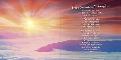 Gottes liebevolle Zusagen für die letzte WegstreckeDieser einfühlsame Bildband beruht auf biblischen Verheißungen. Er wurde geschrieben, um Christen zu ermutigen, die sich auf der letzten Wegstrecke ihres Lebens befinden. Die liebevollen Zusagen und Bilder tun der Seele gut, schenken neue Zuversicht und strahlen himmlischen Frieden aus. Ein Buch zum Lesen oder Vorlesen, das die Zeit des Abschiednehmens von dieser Welt erleichtern und verschönern möchte. Ein Geschenk des Himmels, das Gottes unendliche Liebe spürbar werden lässt.