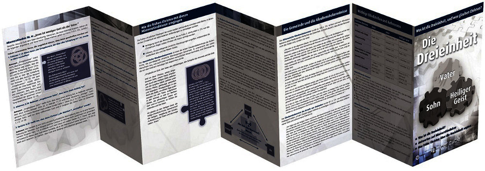 Die Studienfaltkarte erläutert in klarer, knapper Form, was eigentlich gemeint ist, wenn Christen von Dreieinheit sprechen und verdeutlicht dies anhand mehrere Abbildungen und Analogien, etwa durch das Kleeblatt und die Aggregatzustände von Wasser, das in flüssiger Form, als festes Eis oder als Wasserdampf vorkommt ? und doch immer Wasser ist. Die Karte verweist zudem auf mehr als 60 Bibelstellen, bei denen alle drei Personen der Gottheit zusammen genannt werden.