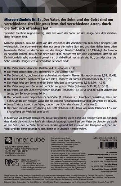 Ausführlich befasst sich die Karte auch mit sechs verbreiteten Missverständnissen, die es im Zusammenhang mit der Dreieinheit Gottes gibt ? und die teils zu massiven Konflikten geführt haben und auch bei Gesprächen mit Menschen aus anderen Religionen oftmals ein Thema sind: