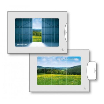 Zu wichtigen Lebensthemen finden Sie je zwei ausdrucksstarke Bilder mit kurzen Text-Impulsen. Das zweite Bild wird erst durch Ziehen sichtbar als Ausdruck eines inneren Weges oder für einen bewussteren Blick. Auf der Rückseite ausgewählte Bibelstellen als Anregung, das Lebensthema zu vertiefen. Doppelkarten zum Beschreiben und/oder Aufstellen.