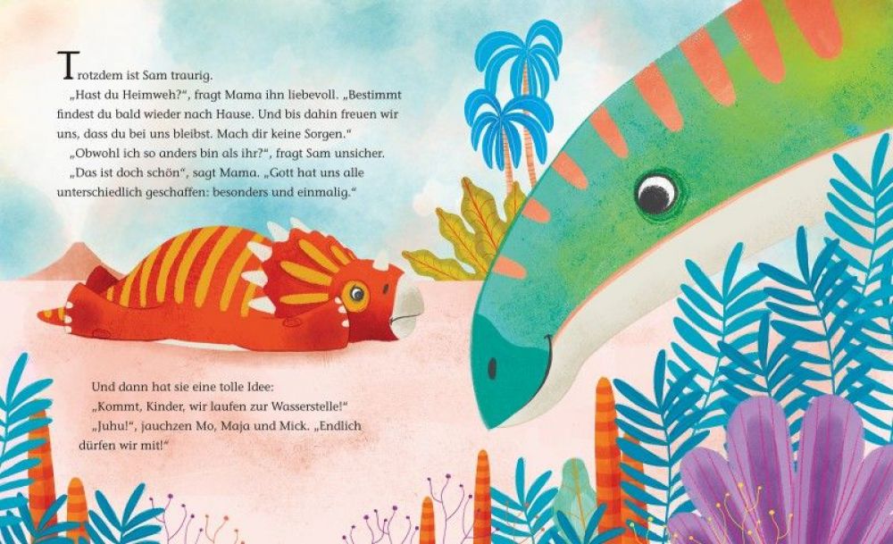 Das farbenfrohe Bilderbuch erzählt anhand der Geschichte von den Dinosauriern, wie gut Gott jeden Einzelnen kennt. Er hat sich etwas dabei gedacht, dass er uns so geschaffen hat, wie wir sind. Jeder ist besonders und einmalig!