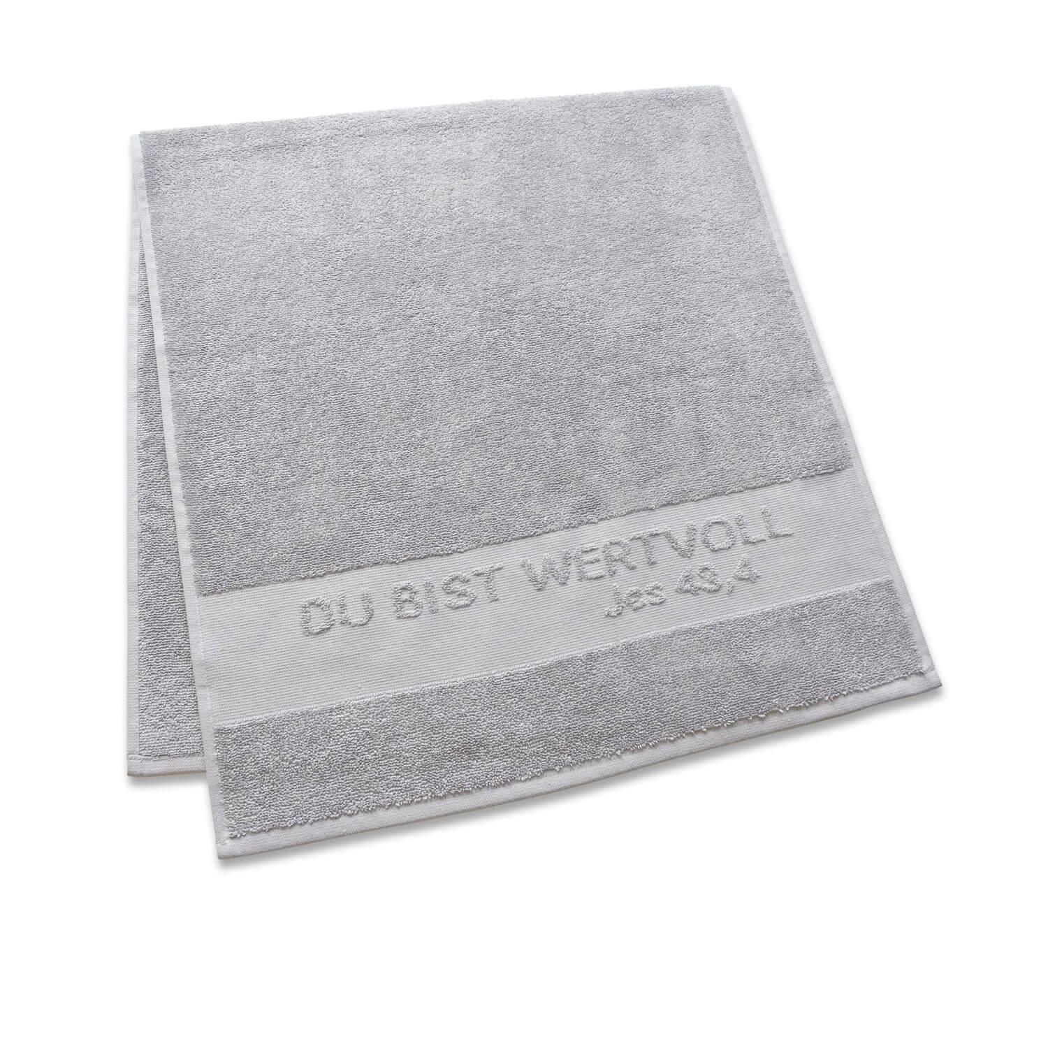 Kuschelweiches Handtuch aus 450 g/qm Baumwoll-Frottee, 50 x 100 cm, 100% Baumwolle, mit Jacquard-gewebtem Vers "Du bist wertvoll Jes 43,4" in Bordüre