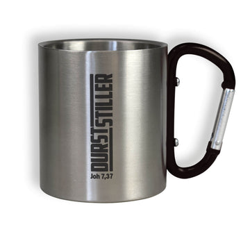 Tasse aus doppelwandigem Edelstahl, mit Karabiner als Griff, bedruckt mit "Durststiller - Joh 7,37".
