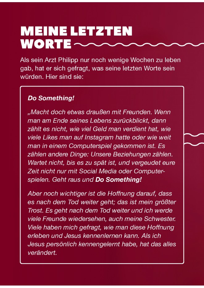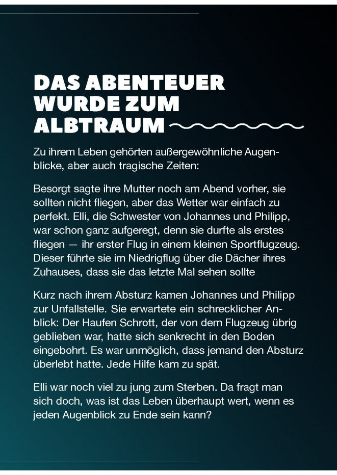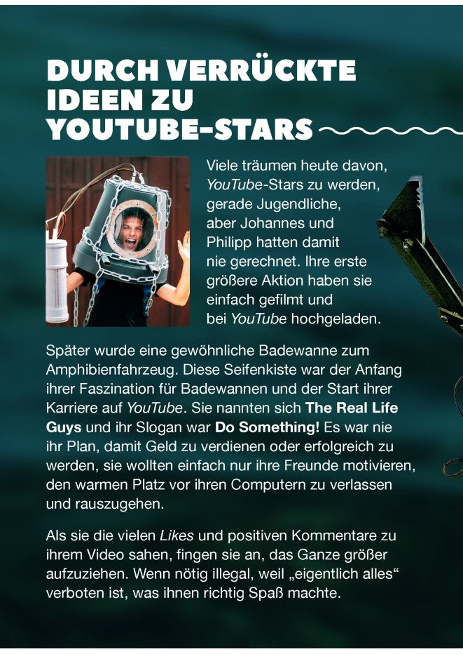 Das neue evangelistische Heft mit den Real Life Guys. Bekannt geworden bei YouTube durch fliegende und tauchende Badewannen sind Philipp und Johannes darüber hinaus in allen Medien präsent durch ihre schweren Schicksalsschläge, in denen sie immer wieder Zeugnis geben für Gott.