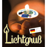 Ein kleiner Lichtgruß mit einer passenden Faltkarte (Format 9 x 9 cm). Das Teelicht ist auf besondere Weise veredelt. Beim Abbrennen schwimmt die Botschaft auf dem flüssigen Wachs und bleibt so - bis auf ein kleines Loch um die Flamme herum - sichtbar.