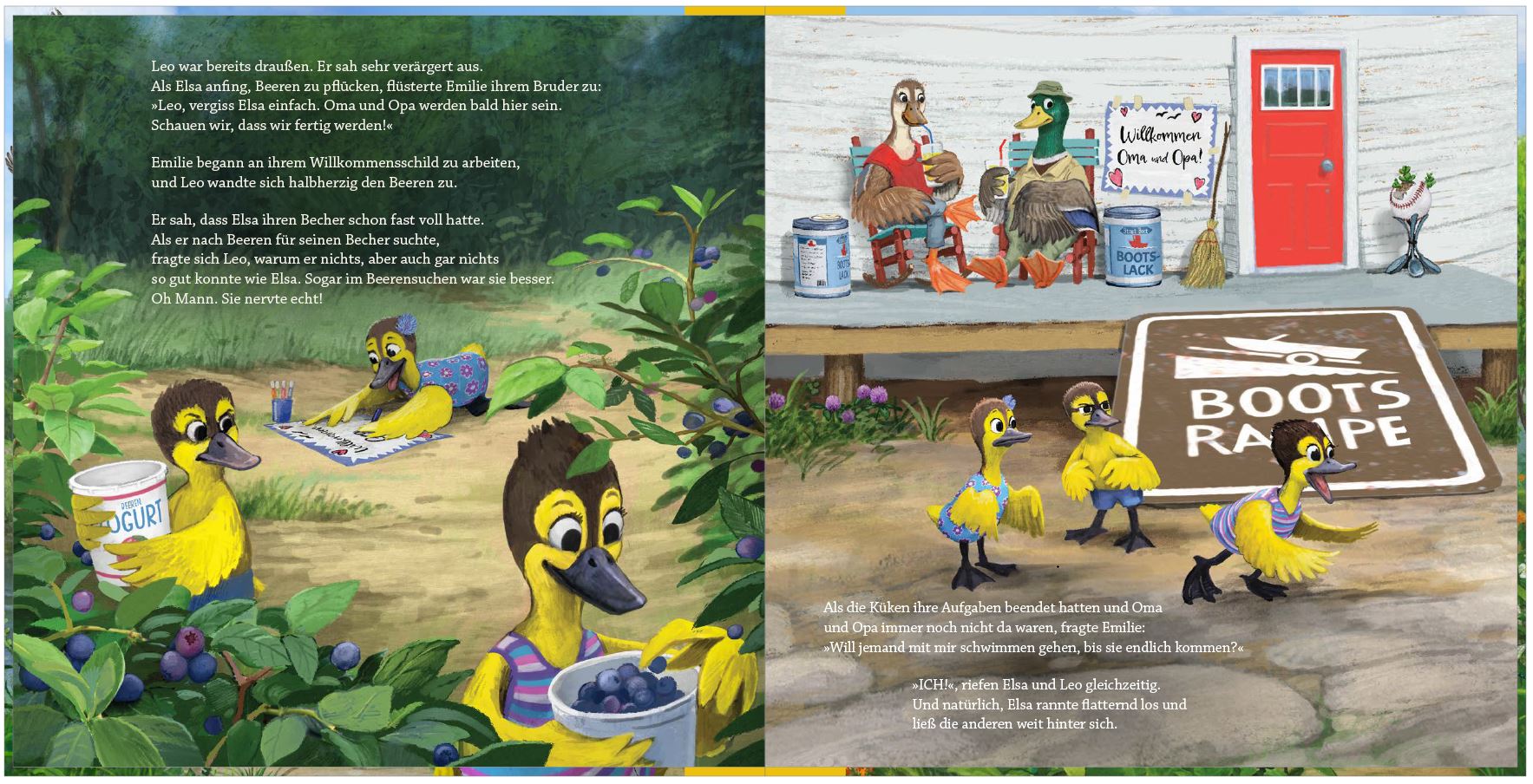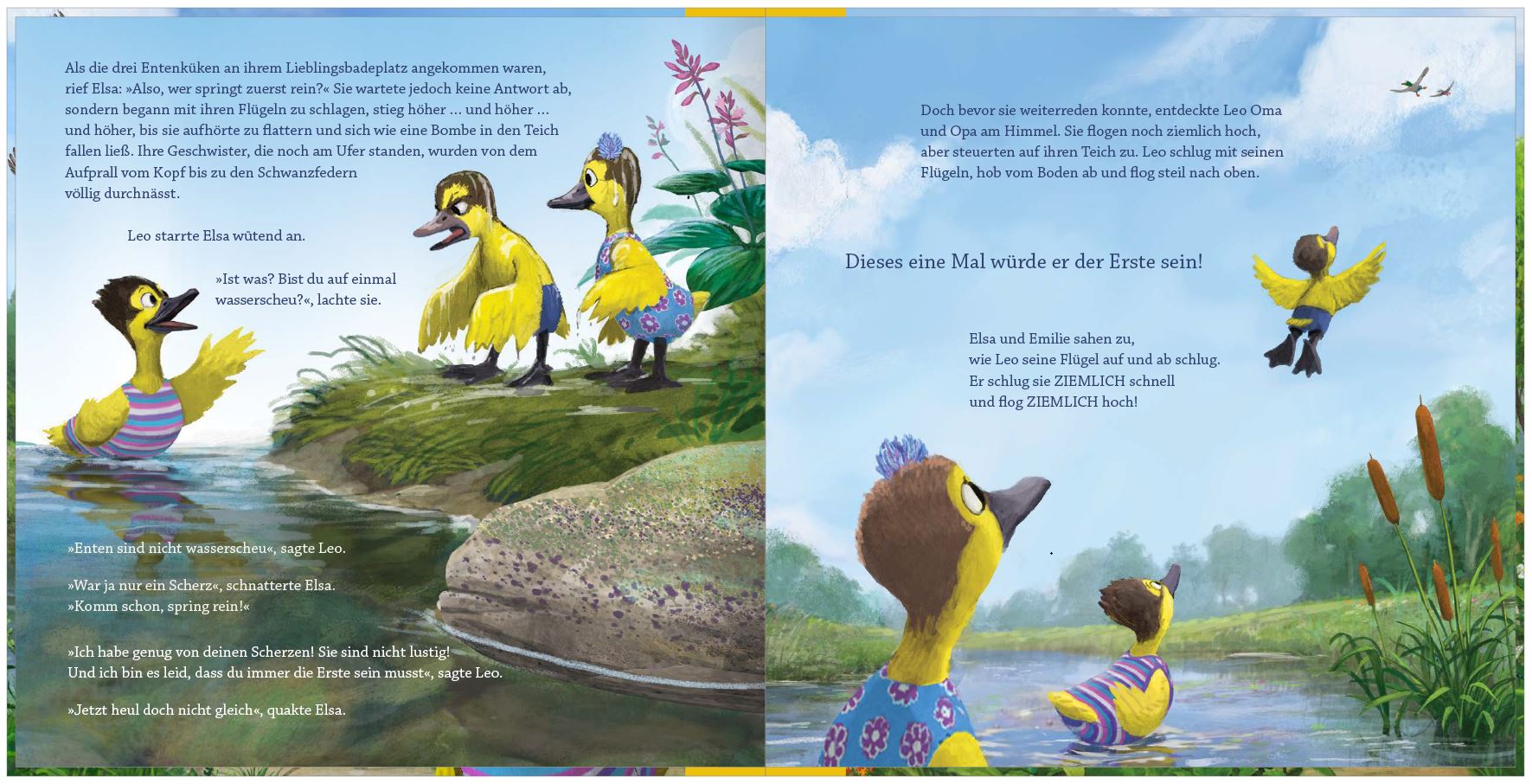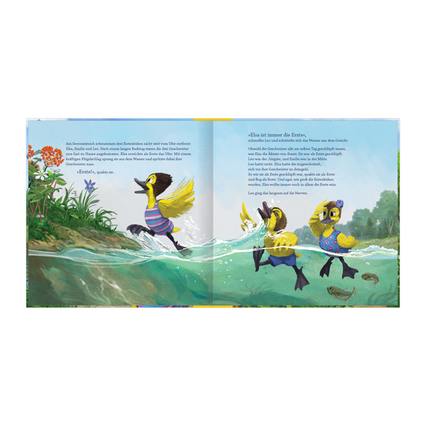 Elsa Ente ist ein paar Sekunden älter als ihre beiden Geschwister. Sie erwartet, dass sie damit immer und bei allem die Erste und Beste sein muss. So entsteht ein Wettstreit unter den Geschwistern, der zu ständigem Streit führt und fast in einer Katastrophe endet.