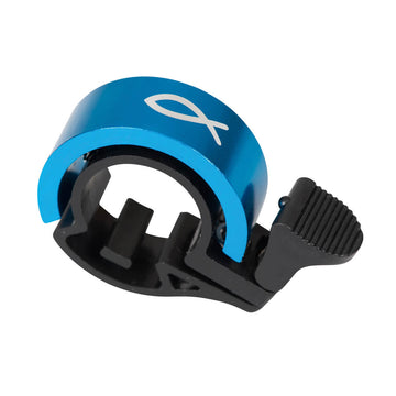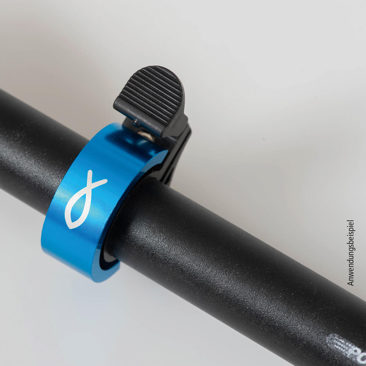 Auf jeder Tour dabei: Stylische Fahrradklingel in blau mit Lasergravur Fischsymbol.