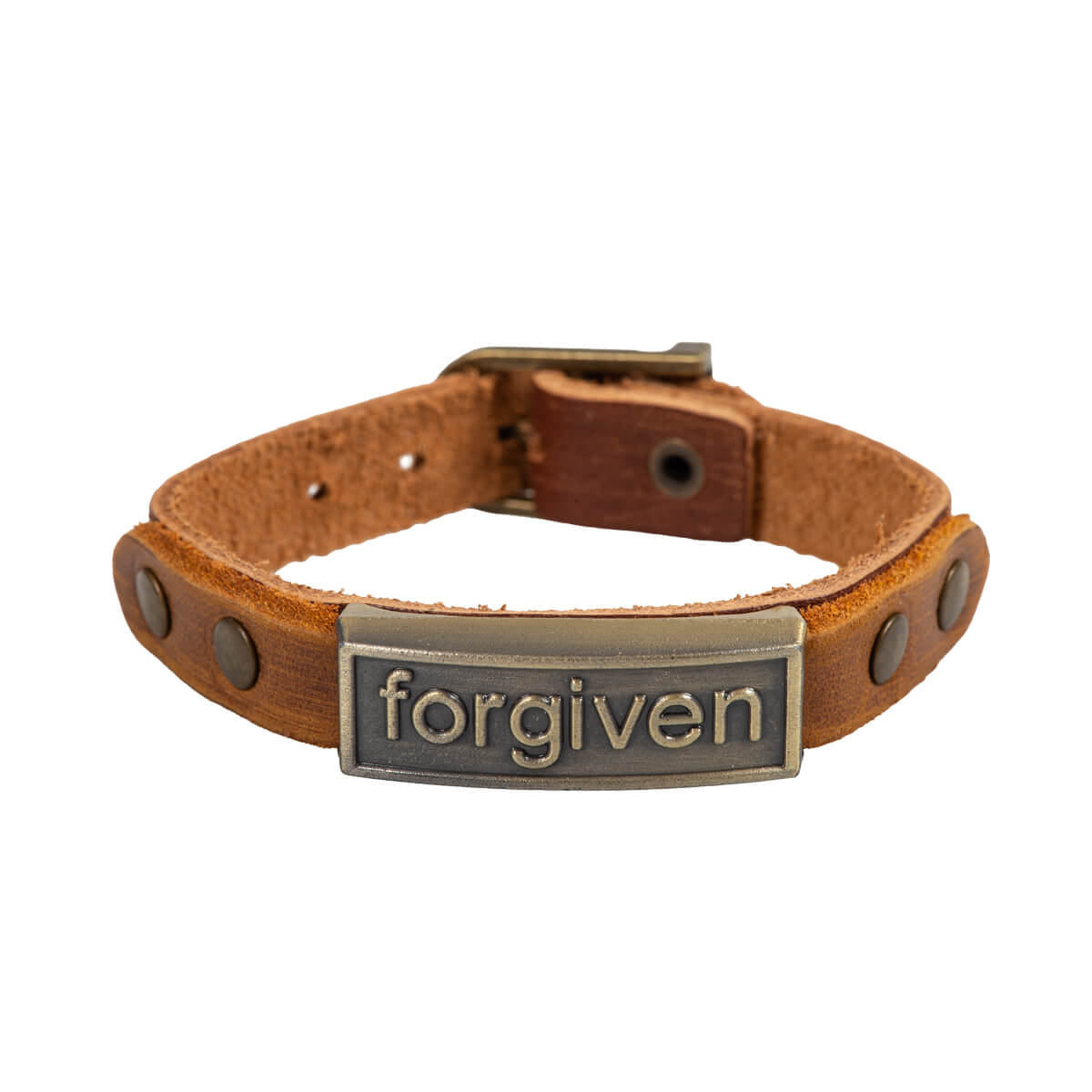 Armband aus braunem Leder mit Nieten und Metallplatte "forgiven" im goldfarbenen Antik-Look.