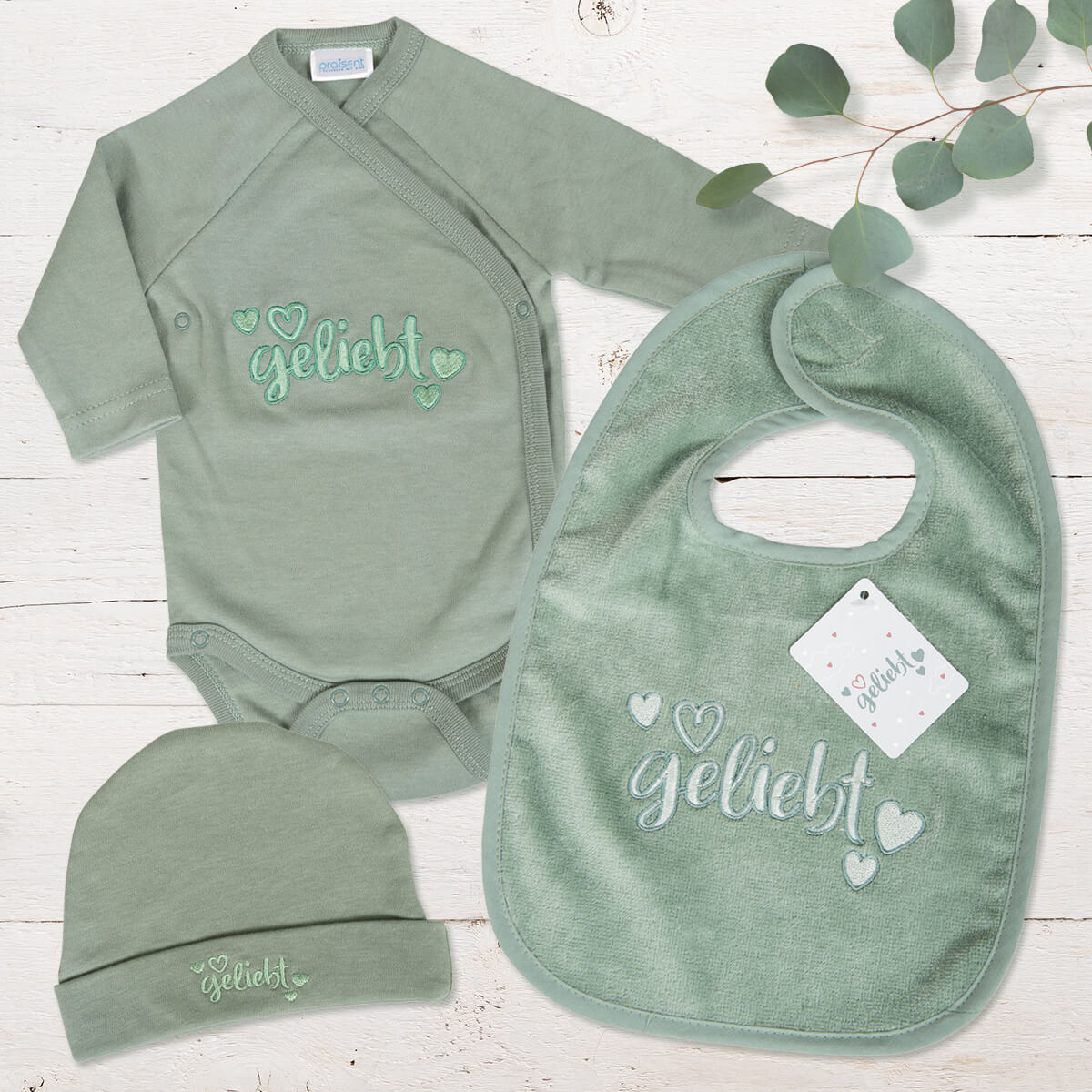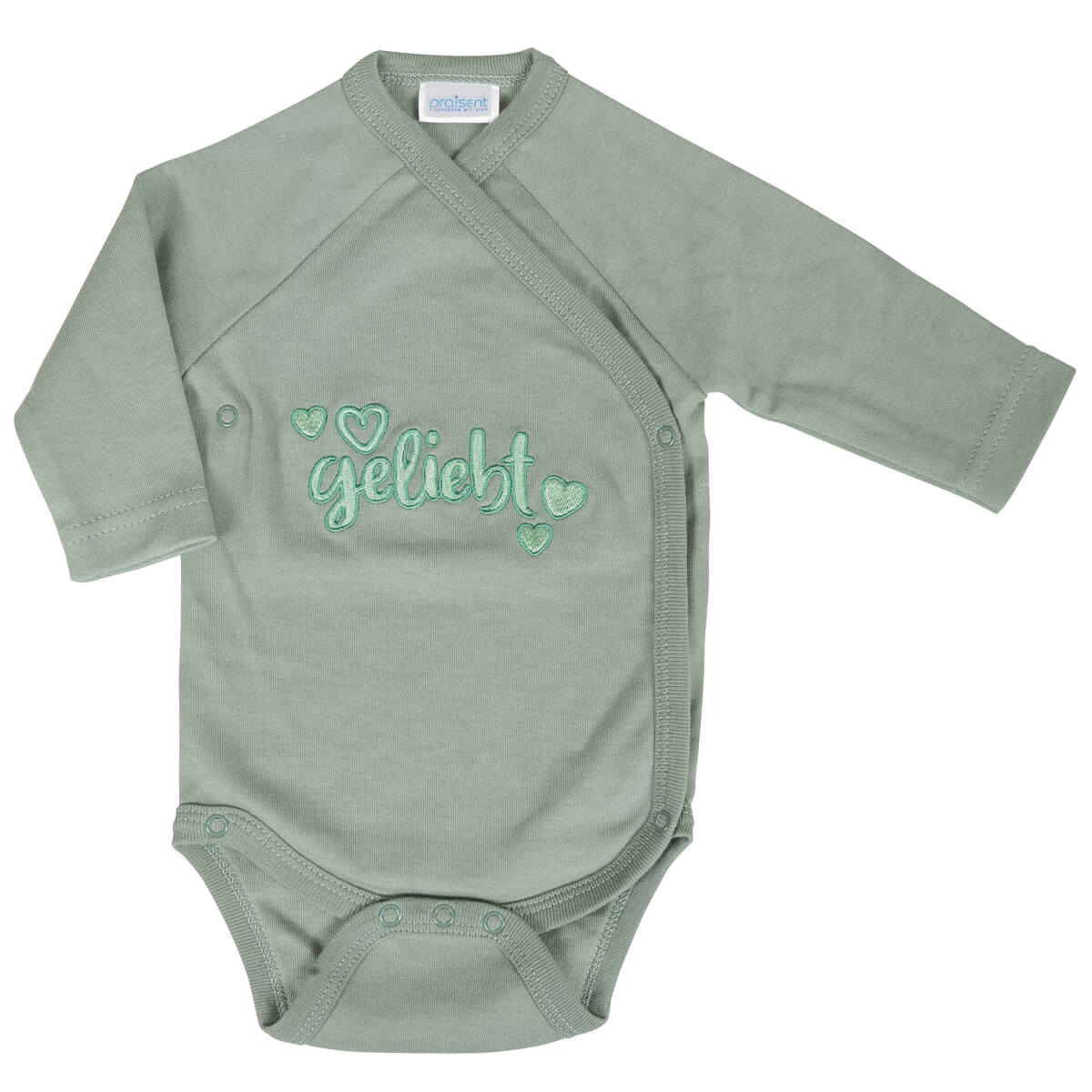 Niedlicher Baby-Body mit langen Armen aus weichem, anschmiegsamen Stoff mit hochwertiger Stickerei "geliebt" und kleinen Herzen.
