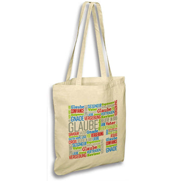 2 Baumwolltaschen mit 4-farbig aufgedruckten Glaubenswörtern in drei Sprachen (Deutsch, Englisch, Französisch), Größe ca. 38x42 cm, mit zwei langen Henkeln (ca. 76 cm),