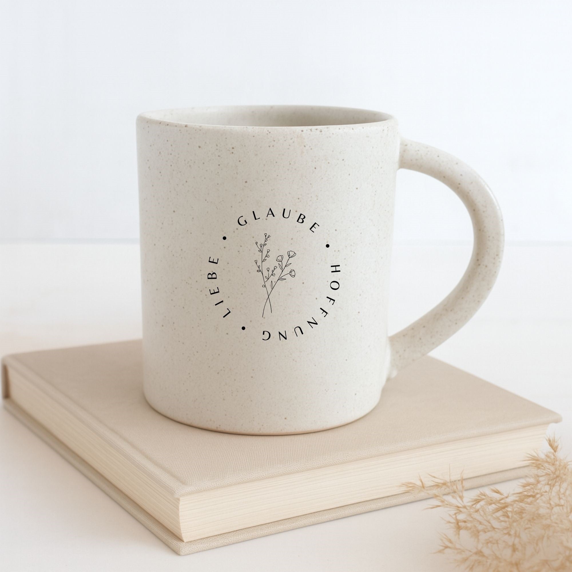 Diese liebevoll handgefertigte Steingut-Tasse mit reaktiver Sesamglasur und der Gravur "Glaube, Hoffnung, Liebe" erinnert an die christlichen Tugenden aus 1. Korinther 13,13. Sie symbolisiert Glauben an Gott, Hoffnung auf seine Verheißungen und Liebe als größtes Gebot. Ein stilvoller Begleiter und eine tägliche Erinnerung an Gottes Gnade.