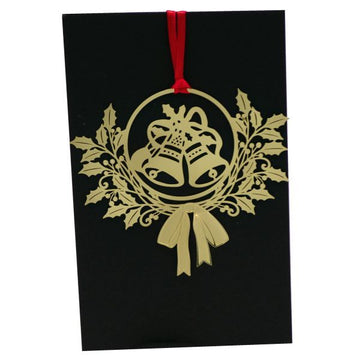 Schöner Baumschmuckanhänger aus glänzendem goldfarbenem Metall an einem edlen Satinband.