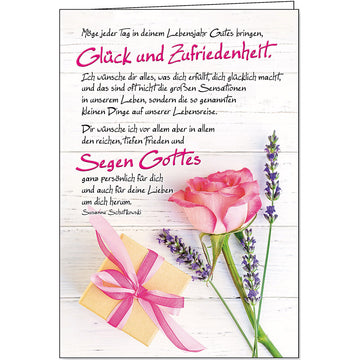 Text: Möge jeder Tag in deinem Lebensjahr Gutes bringen, Glück und Zufriedenheit. Ich wünsche dir alles, was dich erfüllt, dich glücklich macht, und das sind oft nicht die großen Sensationen in unserem Leben, sondern die so genannten kleinen Dinge auf unserer Lebensreise. Dir wünsche ich vor allem aber in allem den reichen, tiefen Frieden und Segen Gottes ganz persönlich für dich und auch für deine Lieben um dich herum.