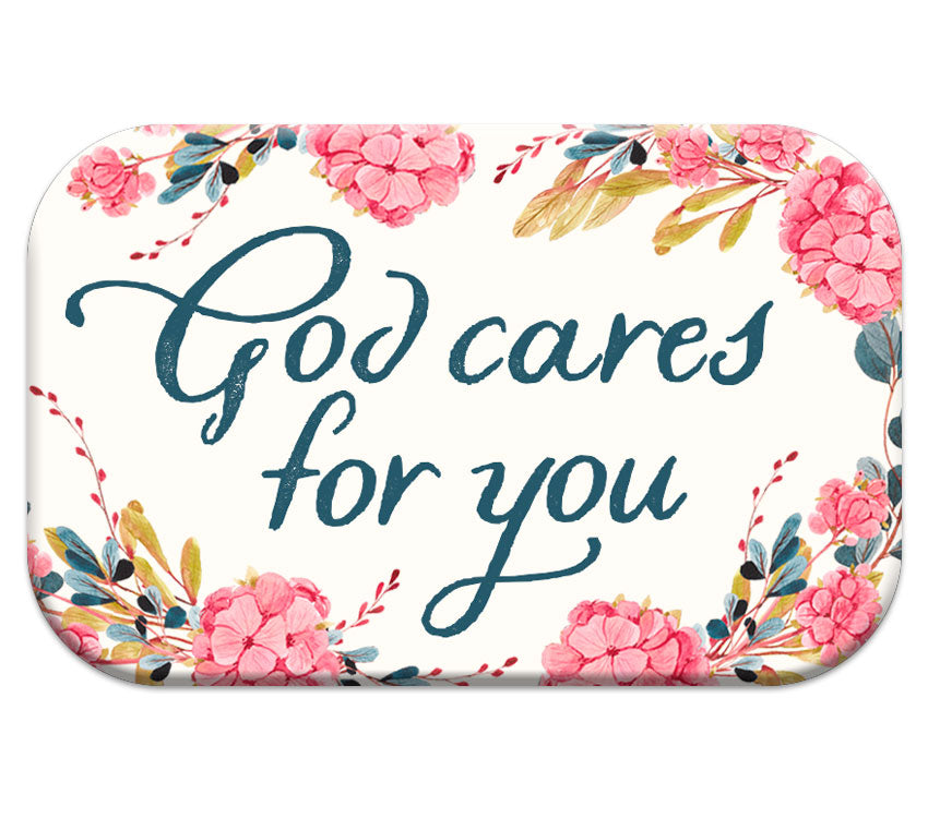 Der Magnet und ein farbiges Kärtchen mit Bibelzitat auf der Rückseite sind zusammen in einer Folie verpackt.