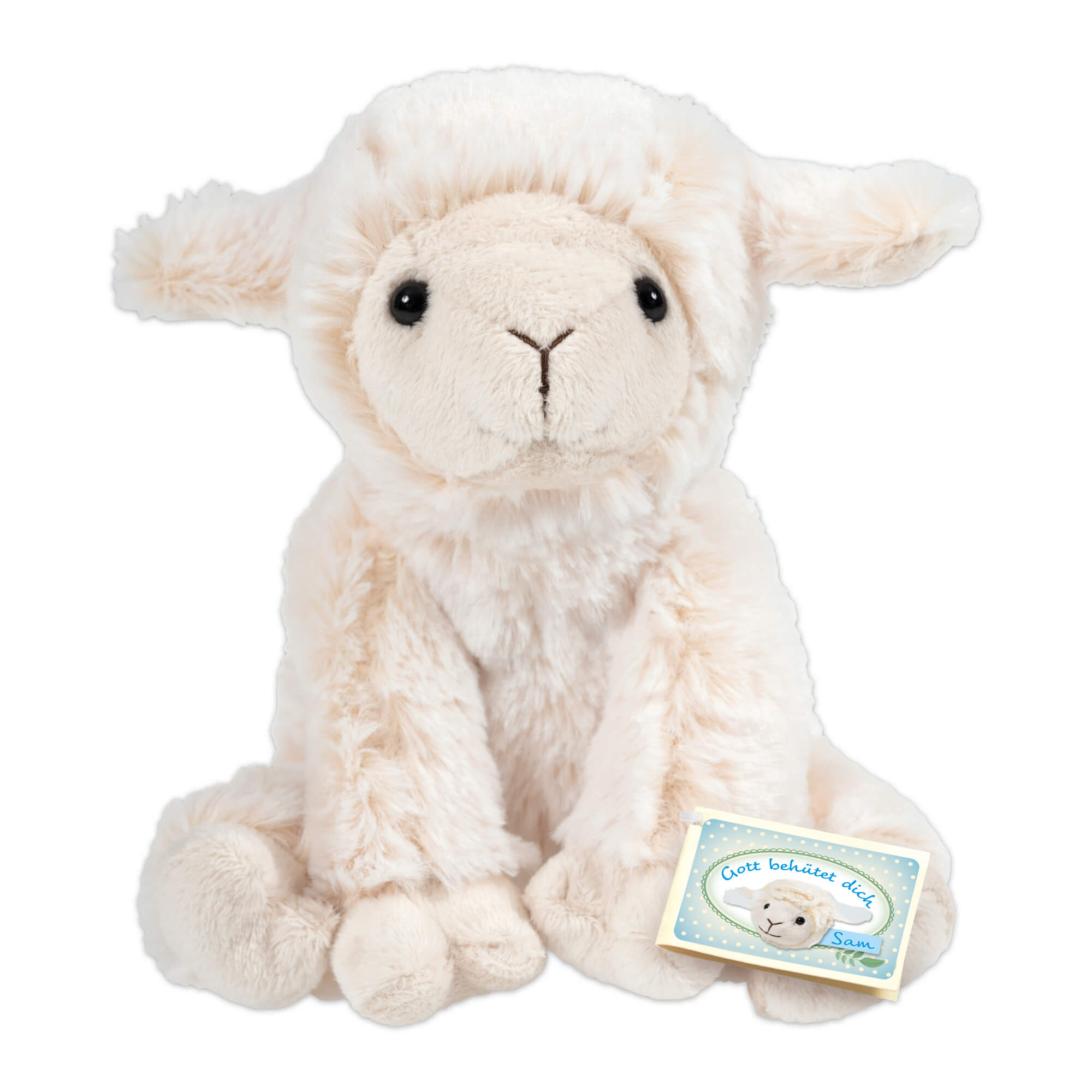 Schäfchen "Sam", aus flauschig-weichem Plüsch ist einfach zum Liebhaben. Cremeweiß, sitzend, ca. 15 cm, 100% Polyester, mit Anhängerkärtchen und Vers "Gott behütet dich", geprüfte Sicherheit und Qualität, handwaschbar bei 30 C