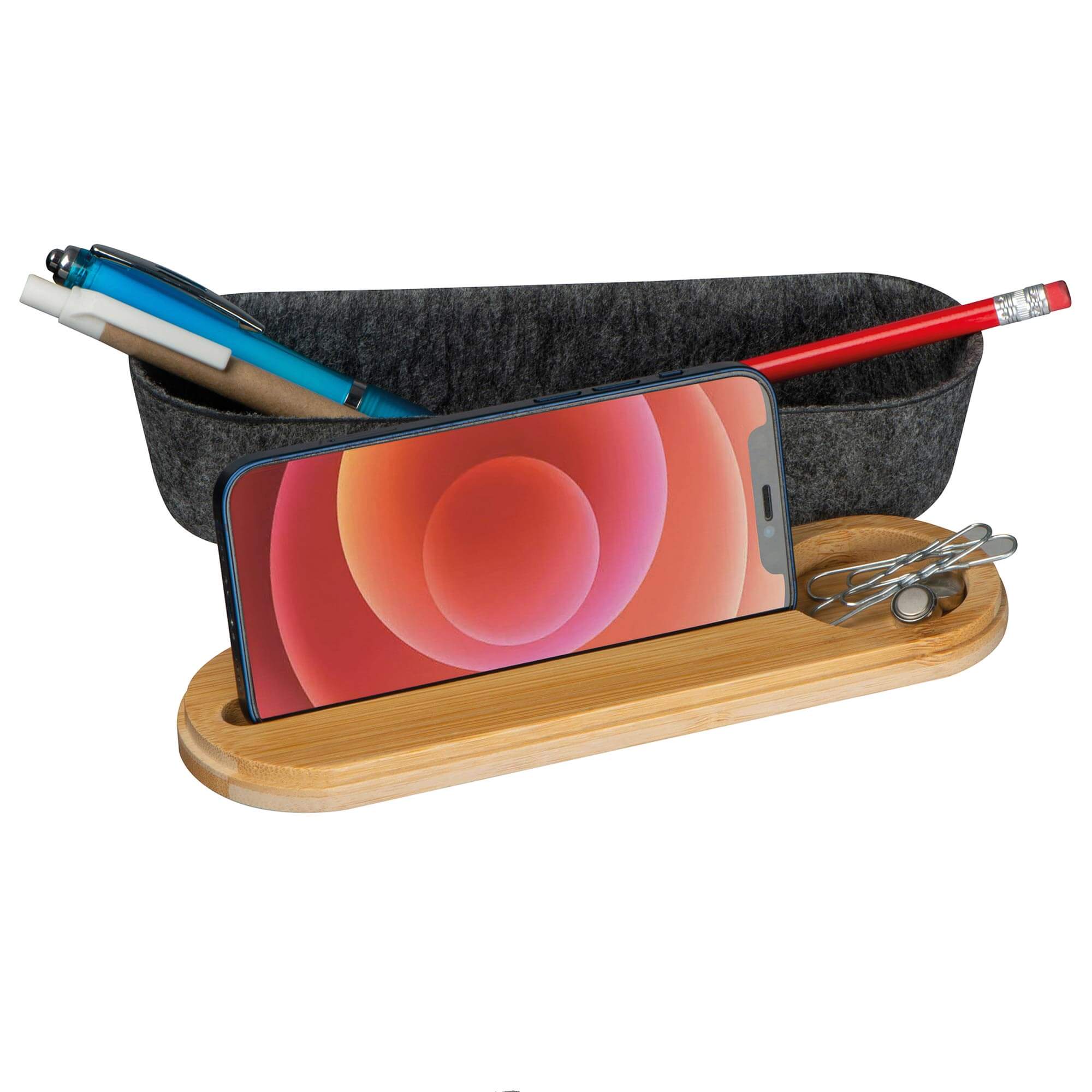 Umweltfreundlich und innovativ: Dieses vielseitige Etui aus recyceltem Filz mit multifunktionalem Bambusdeckel und cleveren Details.
