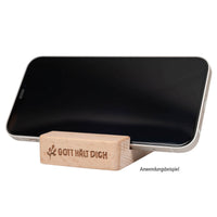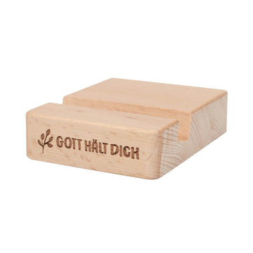 Telefonhalter aus Holz mit gelasertem Text: "Gott hält dich".