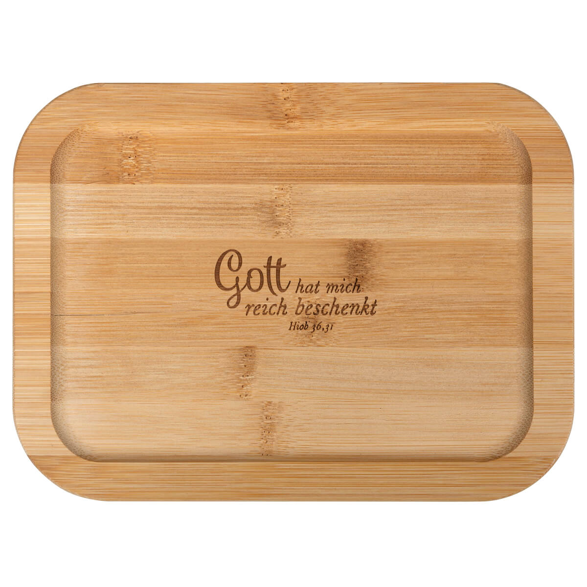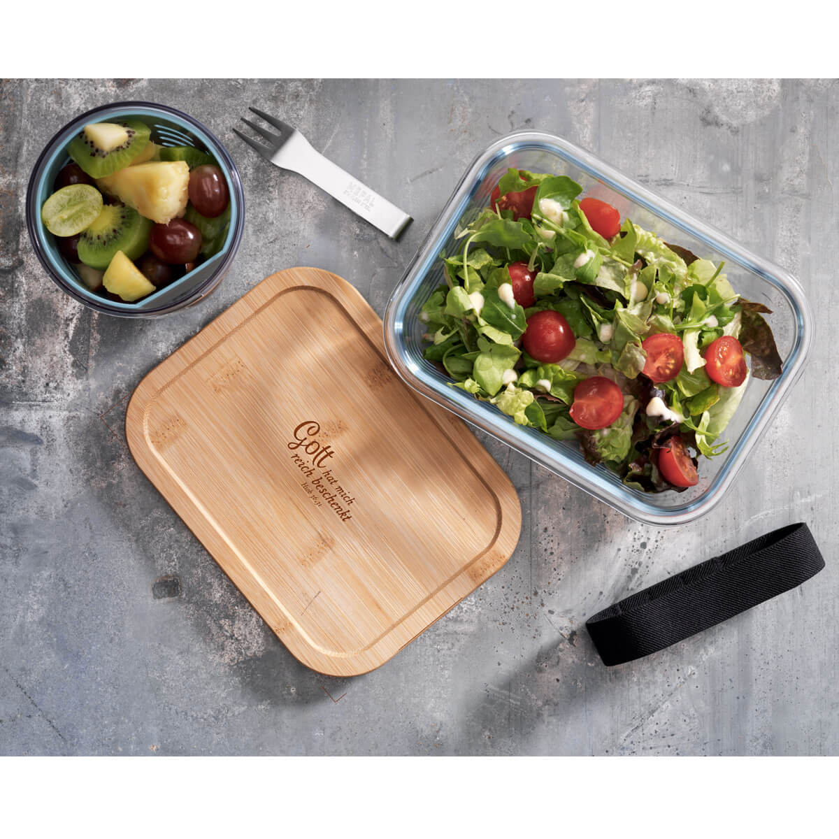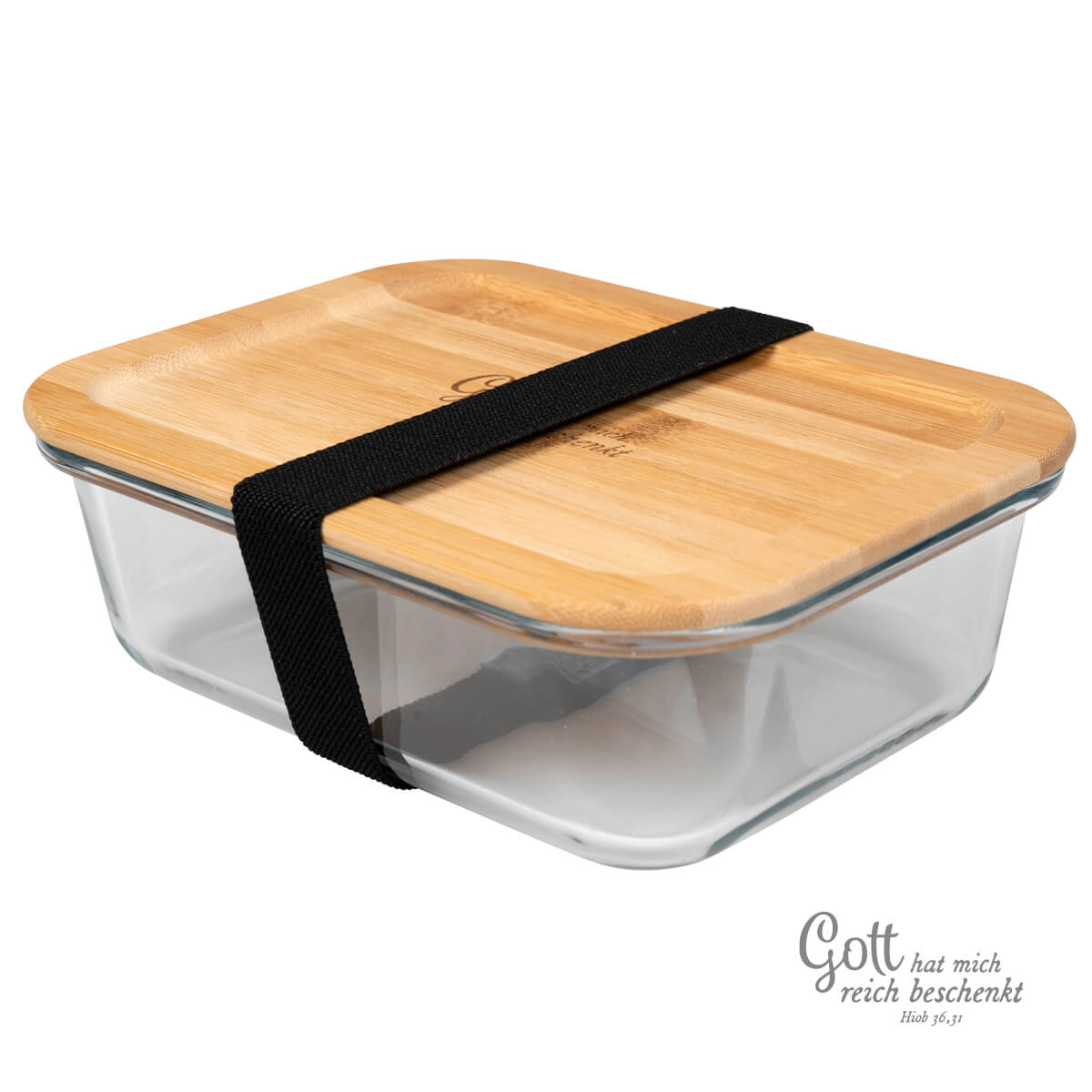 Schicke Lunchbox mit der Gravur "Gott hat mich reich beschenkt - Hiob 36,31" aus hochwertigem Borosilikatglas, die hohen Temperaturunterschieden standhält. Mit einem Bambus-Deckel, der dank der Silikonkante an der Unterseite perfekt schließt. Damit kann der Inhalt luftdicht gelagert werden und die Lunchbox ist somit auch als Frischebox geeignet. Inkl. elastischem Verschlussband.