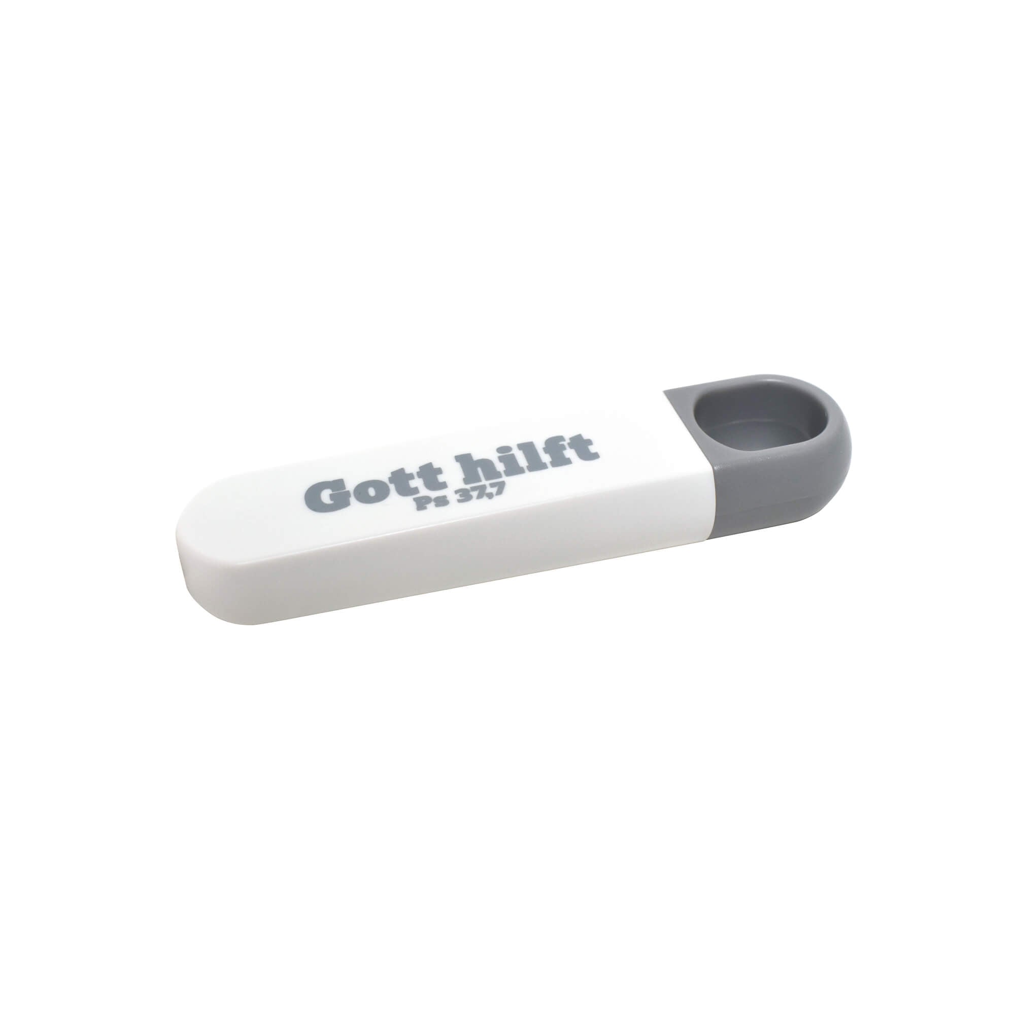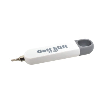 Praktisch: Durch einen Magnet werden die Bits an der Spitze des Gehäuses befestigt. Bedruckt ist das Werkzeug für die Hosentasche mit dem Text "Gott hilft - Ps 37,7".