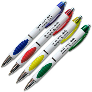4er Set Kugelschreiber aus Kunststoff mit Aufdruck Gott liebt dich so wie du bist, geriffelter Einsatz im Griffstück und Clip in den Farben grün, blau, gelb und rot.