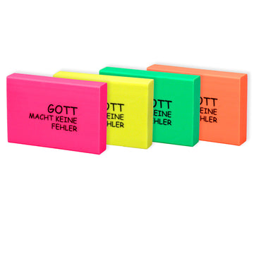 Radiergummis im 4er Set mit Text "Gott macht keine Fehler", ca. 4x3,5 cm, je 1x neon-pink, neon-gelb, neon-grun und neon-orange.
