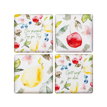 4 schöne Magnete im Set! Je zwei Stück mit Text und Früchten. Eine trendige Kleinigkeit zum Verschenken, oder als schöne Dekoration am Kühlschrank oder der Magnetwand.