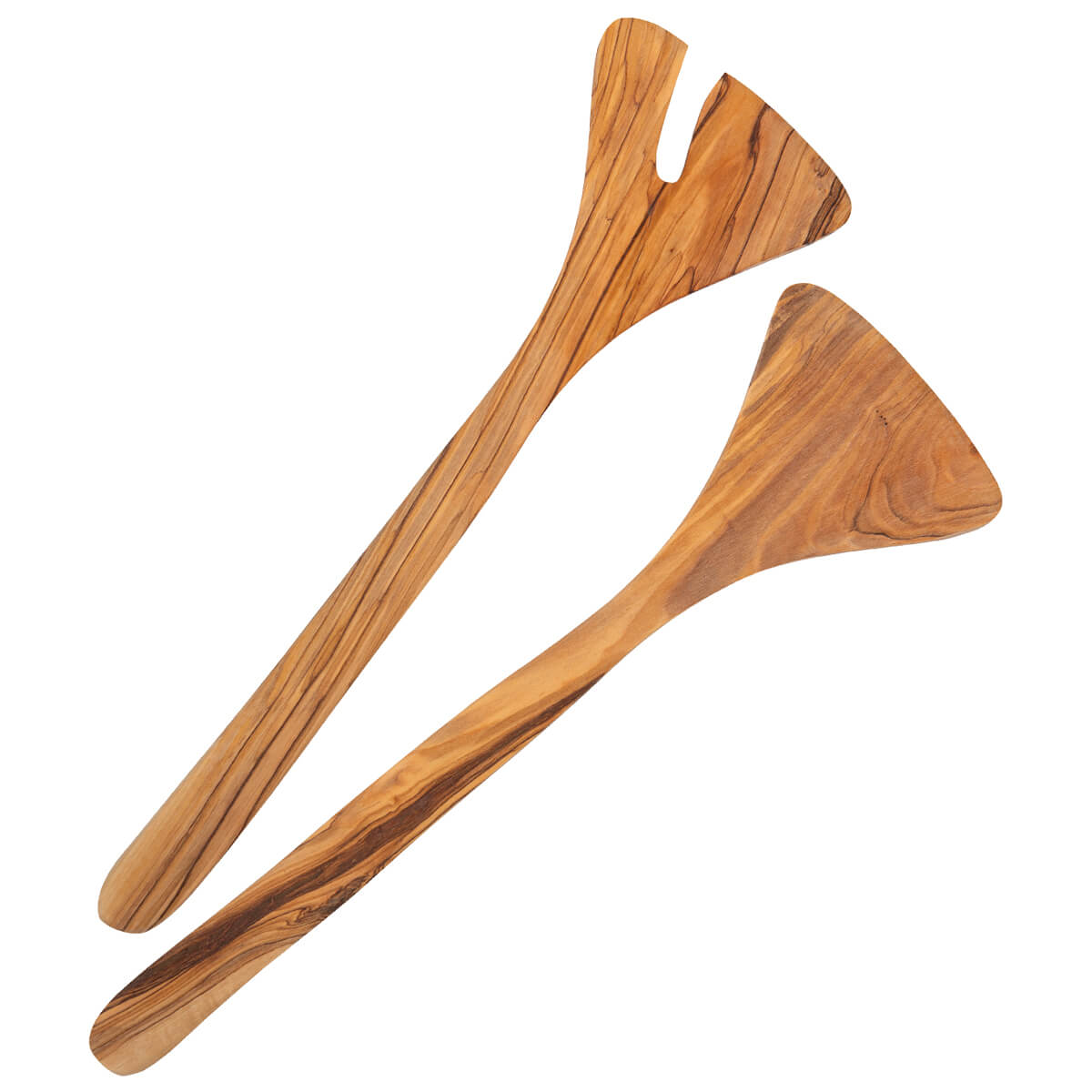Ein tolles, nützliches Geschenk, nicht nur im Sommer: das zweiteilige Salatbesteck aus hochwertig verarbeitetem Olivenholz aus Bethlehem. Dank seiner dunklen Holzfarbe und der schönen Maserung wird das Besteck zum echten Blickfang auf dem Tisch.