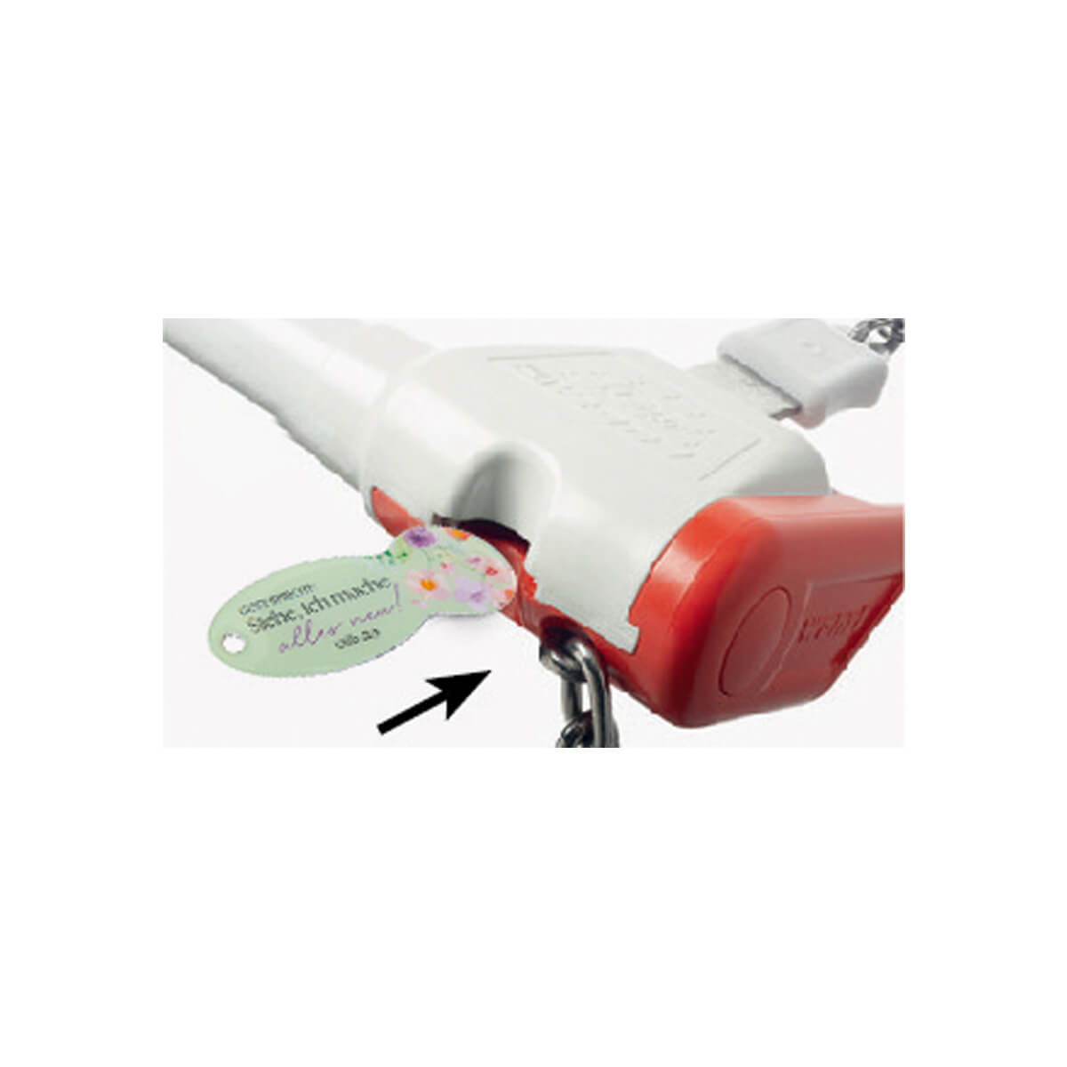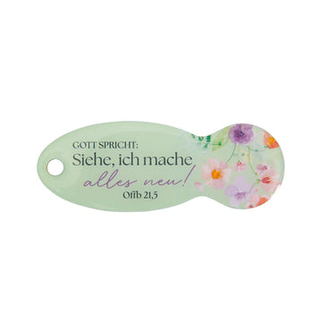 Einkaufen ohne Chip oder Münze: Der Einkaufswagenhelfer mit schönem Motiv und dem Text der Jahreslosung 2026 "Gott spricht: Siehe, ich mache alles neu! " bewahrt man am besten am Schlüsselbund auf.