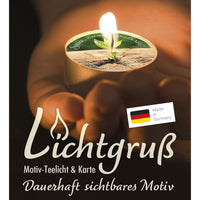 Ein kleiner Lichtgruß mit einer passenden Faltkarte (Format 9 x 9 cm). Das Teelicht ist auf besondere Weise veredelt. Beim Abbrennen schwimmt die Botschaft auf dem flüssigen Wachs und bleibt so - bis auf ein kleines Loch um die Flamme herum - sichtbar.
