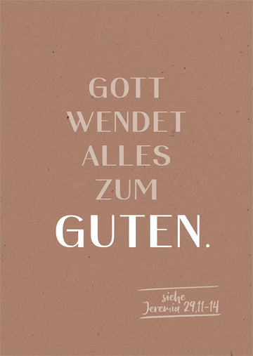 Die stilvolle Karte trägt den kraftvollen Text "Gott wendet alles zum Guten." in eleganter "Fatzer alive"-Typografie. Diese Aussage ist angelehnt an die Bibelverse aus Jeremia 29,11 - 14, die uns versichern, dass Gottes Pläne für uns immer gut sind - auch wenn wir im Moment vielleicht nicht alles verstehen können. Auch in schwierigen Zeiten dürfen wir darauf vertrauen, dass Gott unser Leben lenkt und das Beste für uns bereithält.