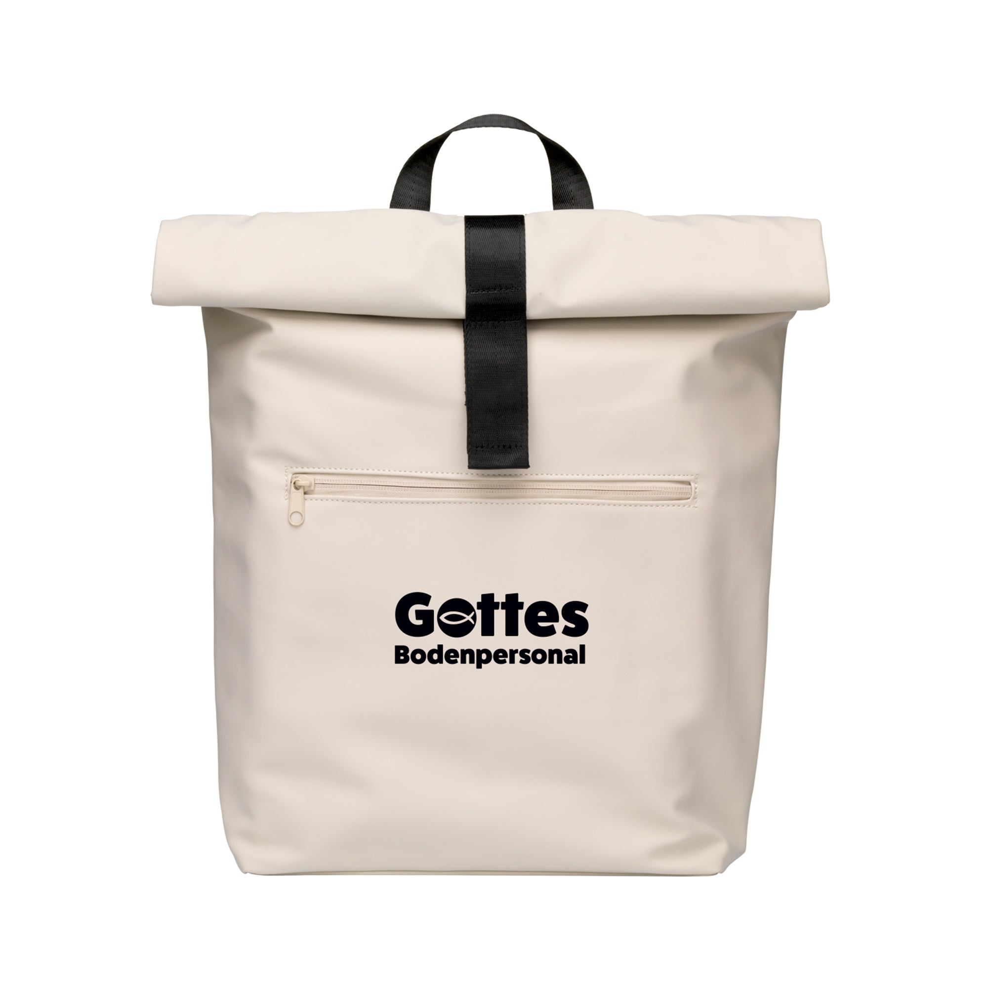 Robuster "Rolltop"-Laptop-Rucksack aus wasserabweisendem PU, hergestellt aus recyceltem Material und bedruckt mit dem beliebten "Gottes Bodenpersonal".