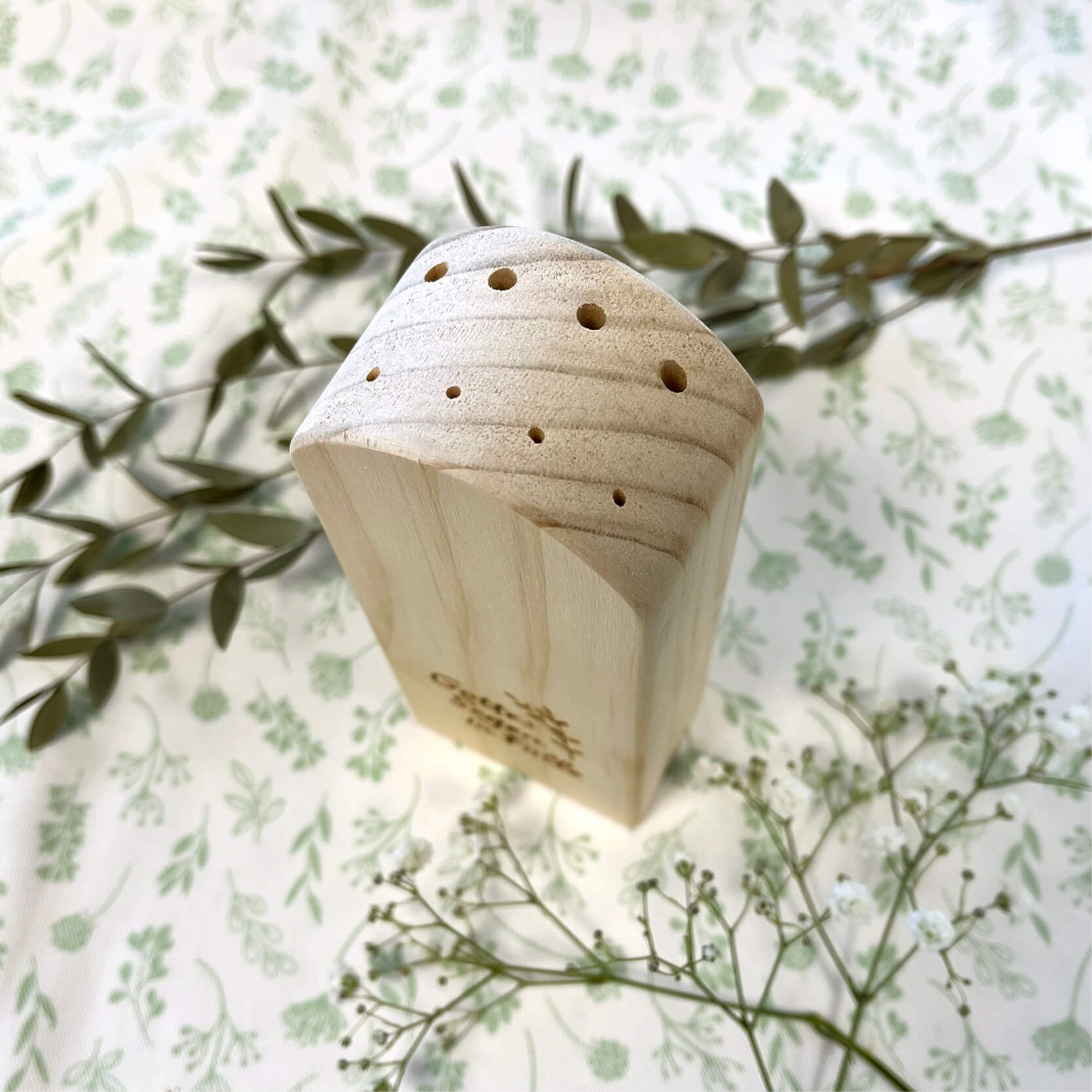 Mit dem Blumen- und Gräserblock aus naturbelassenem Kiefernholz kann man sich im Handumdrehen ein tolles Flowergram zusammenstellen: Einfach getrocknete Blumen und Gräser in die acht vorgebohrten Löcher stecken. So kann man die natürliche Deko auch immer den Jahreszeiten anpassen.