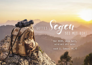 Der Text "Gottes Segen sei mit dir!" in Kombination mit dem Bibelvers nach 2. Samuel 14,17: "Der HERR, dein Gott, wird mit dir sein." macht diese Karte zu einer ermutigenden Botschaft. Sie eignet sich besonders, um Zuversicht und Segen auf den Lebensweg mitzugeben.