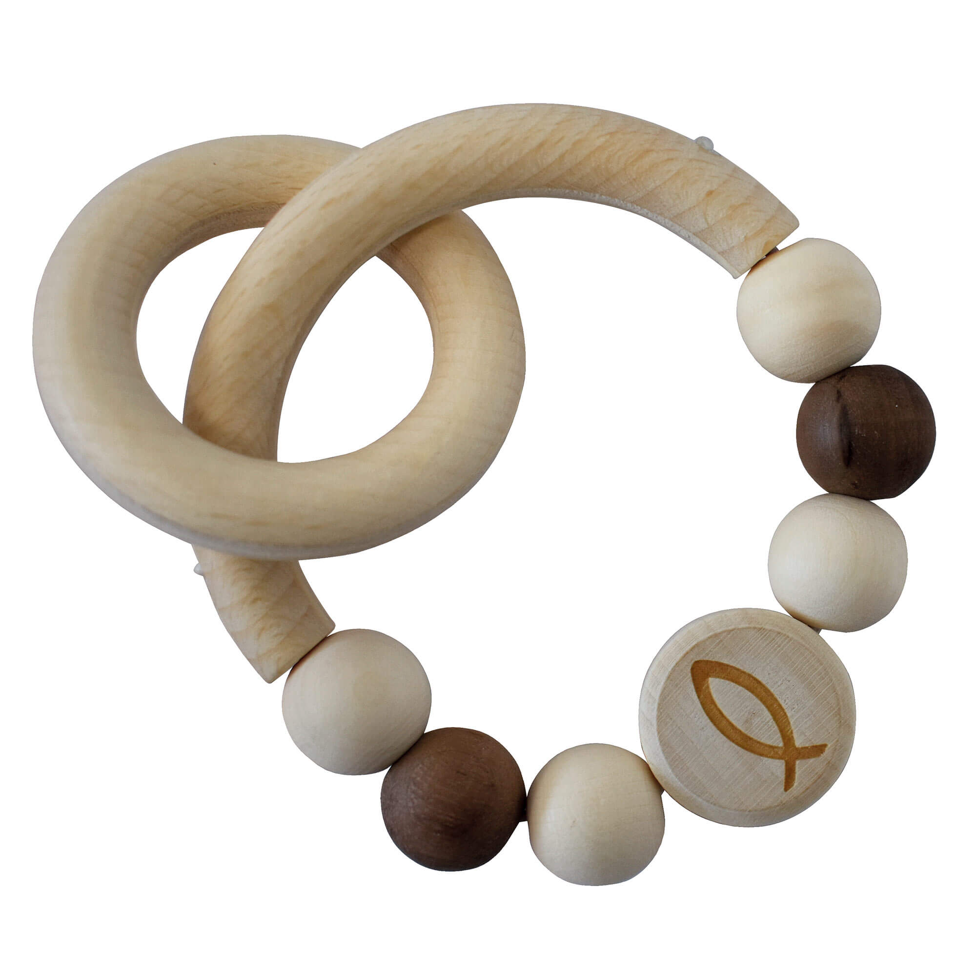 Greifling gefertigt aus ausgesuchten heimischen Hölzern, ungiftige Farben, speichelecht, Naturperlen. Eine Perle ist mit dem Ichthys-Symbol lasergraviert.