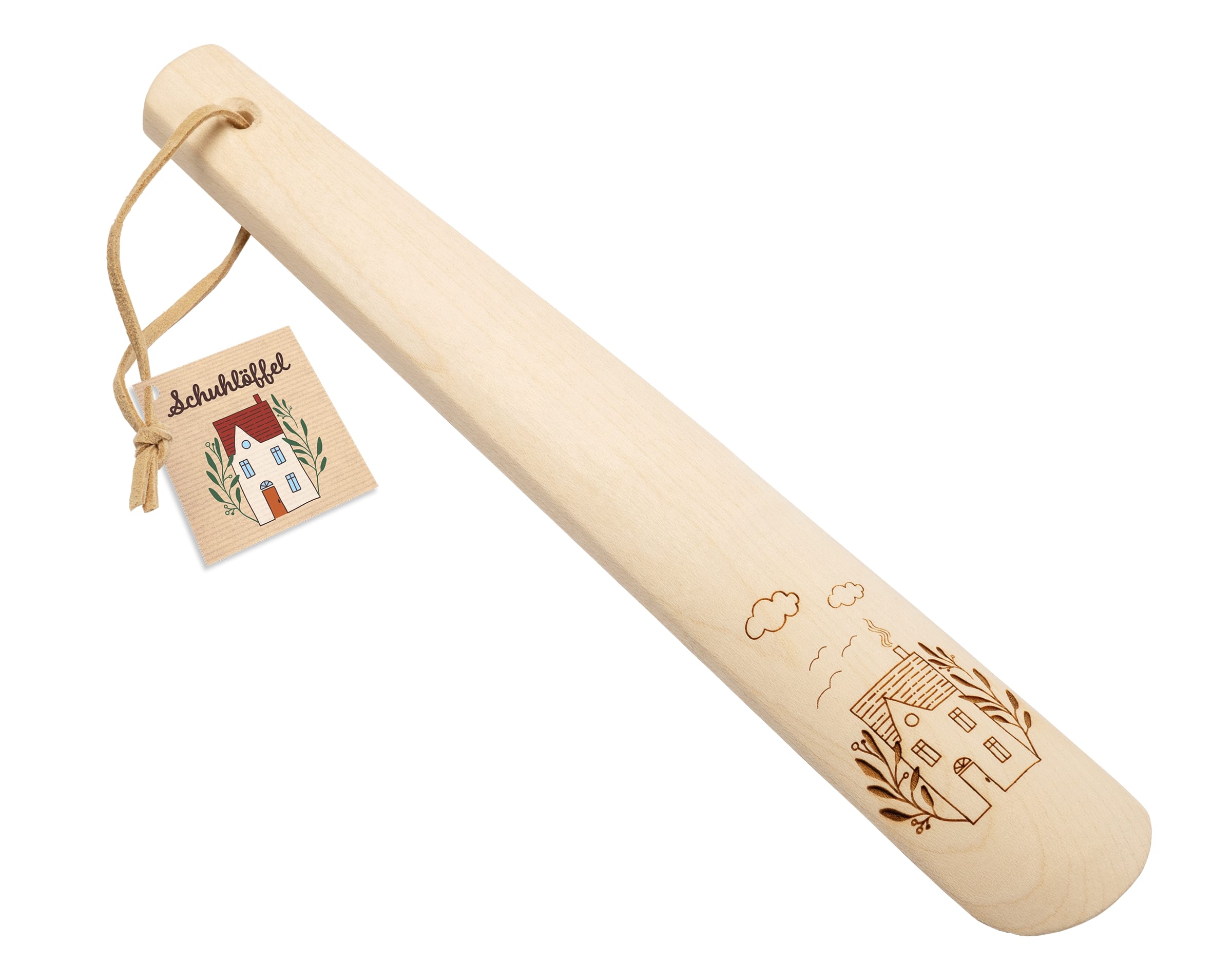 Ein praktischer, handlicher Schuhlöffel mit einem schön gravierten Hausmotiv.