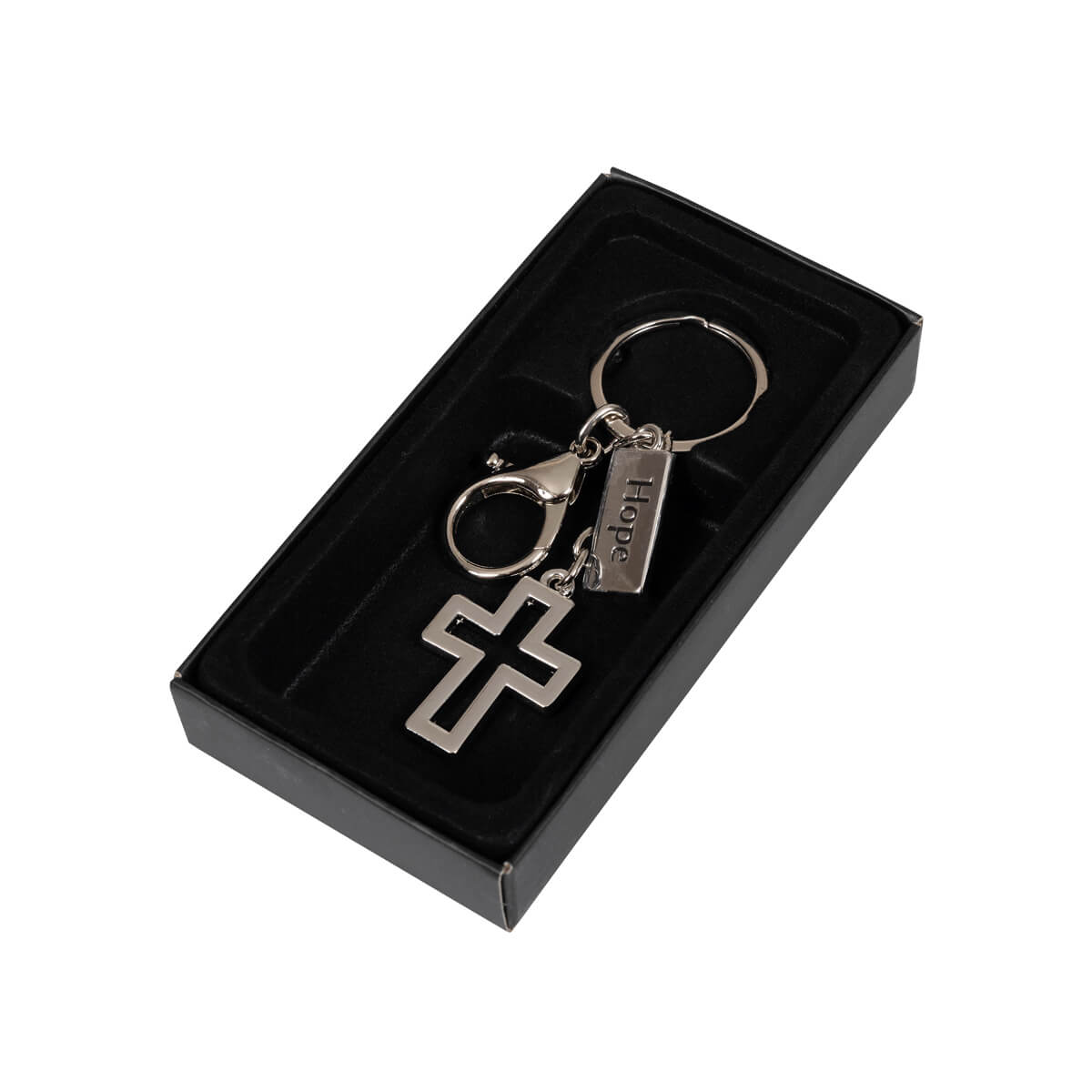 Schlüsselanhänger Kreuz mit Metall Anhänger "Hope" und Karabiner.