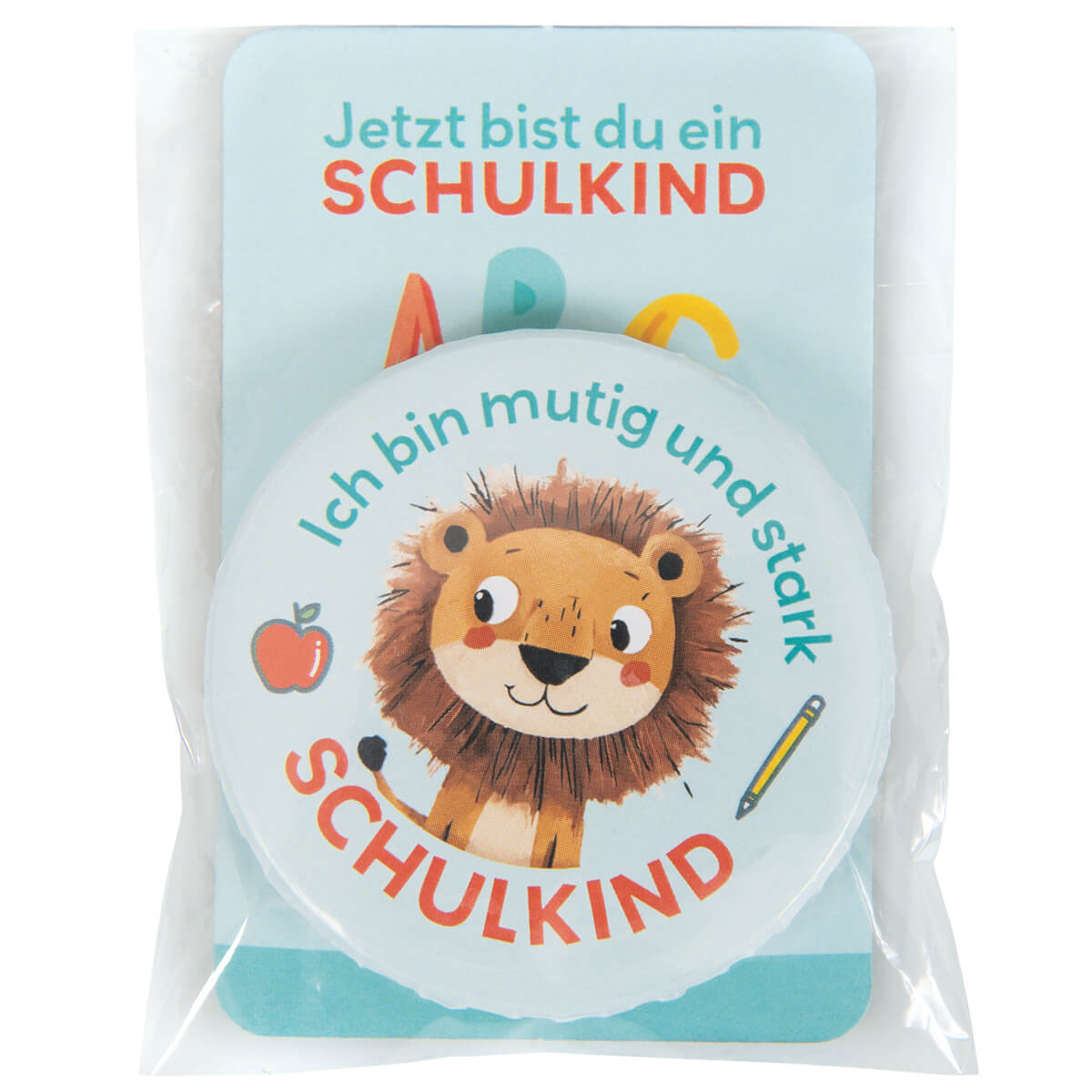 Der niedliche Button mit Löwe und Text "Schulkind - Ich bin mutig und stark" ist aus umweltfreundlich hergestelltem und recycelbarem Material.