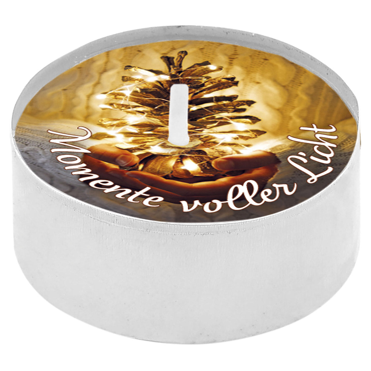 Ein kleiner Lichtgruß mit einer passenden Faltkarte (Format 9 x 9 cm). Das Teelicht ist auf besondere Weise veredelt. Beim Abbrennen schwimmt die Botschaft auf dem flüssigen Wachs und bleibt so - bis auf ein kleines Loch um die Flamme herum - sichtbar.