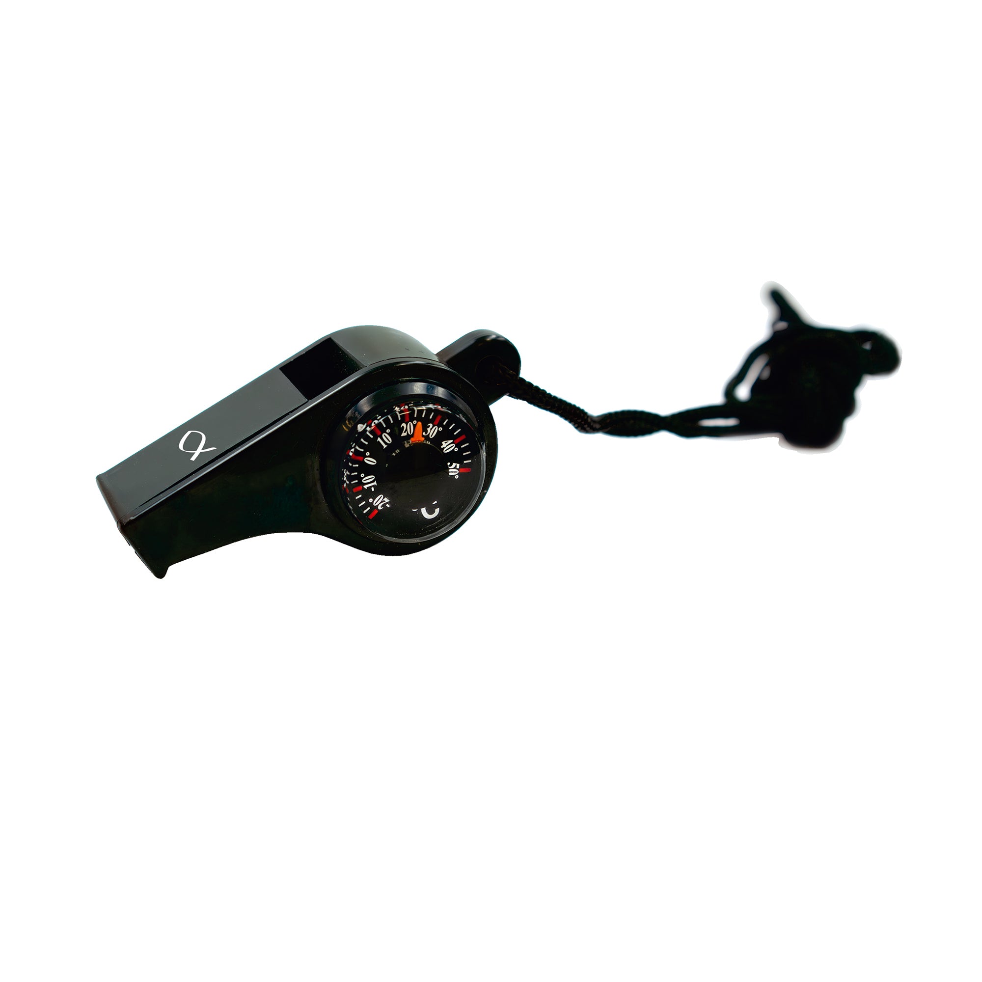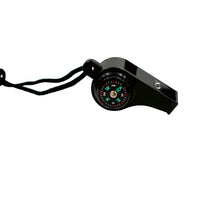 Schicke Multifunktion-Trillerpfeife mit Kompass und Thermometer (Anzeige in Celsius) an der Seite.